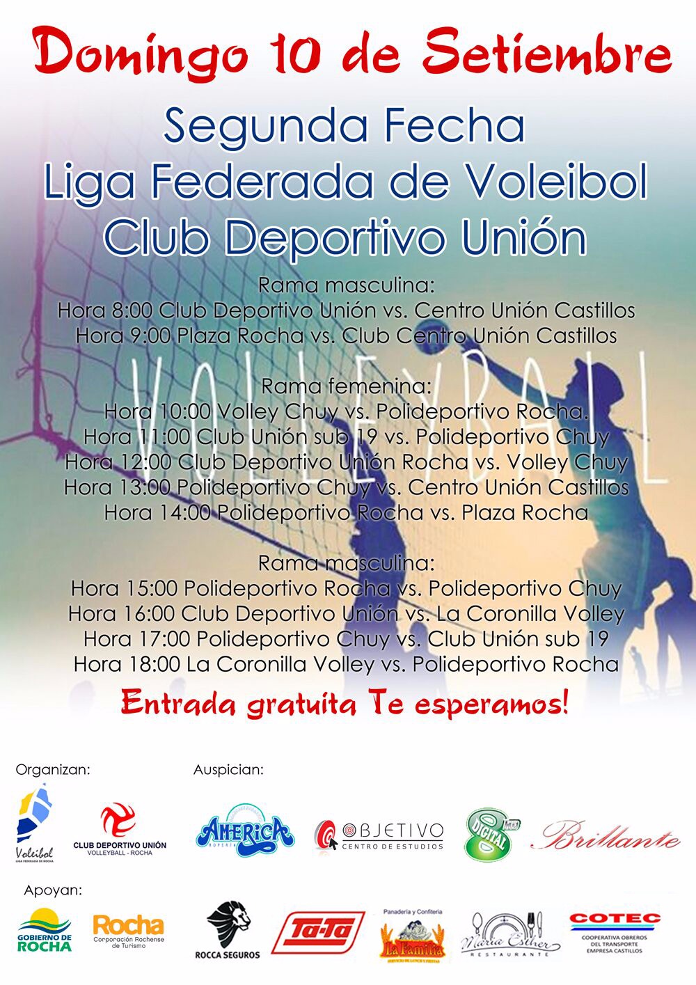 El próximo domingo 10 de setiembre del corriente en el Club Deportivo Unión de Rocha a partir de las ocho de la mañana y durante todo el día, se estará disputando la segunda fecha del campeonato departamental de volleyball de la Liga Federada de Voleibol de Rocha.