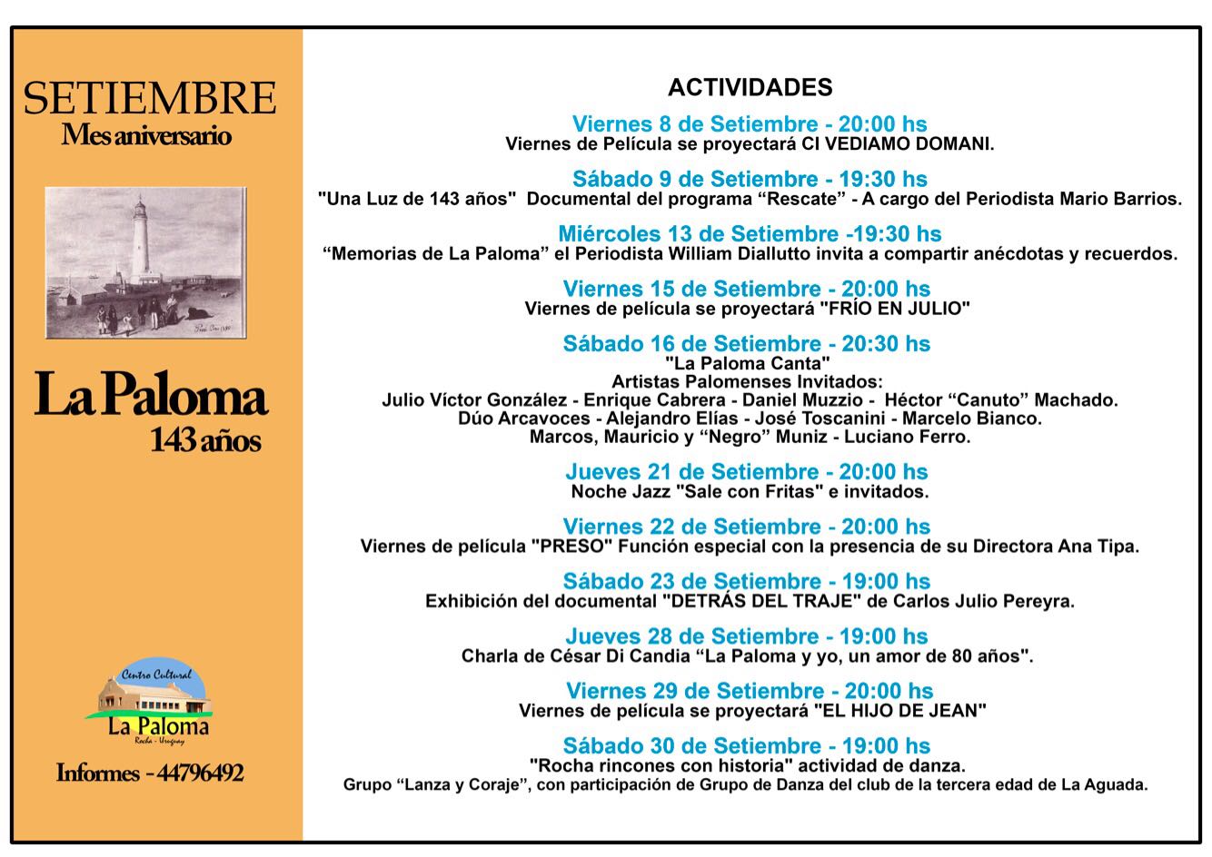 La Dirección del Centro Cultural informa su agenda de actividades del mes de Setiembre, mes aniversario. Cine, documentales, charlas, danza y música son parte de las actividades programadas.