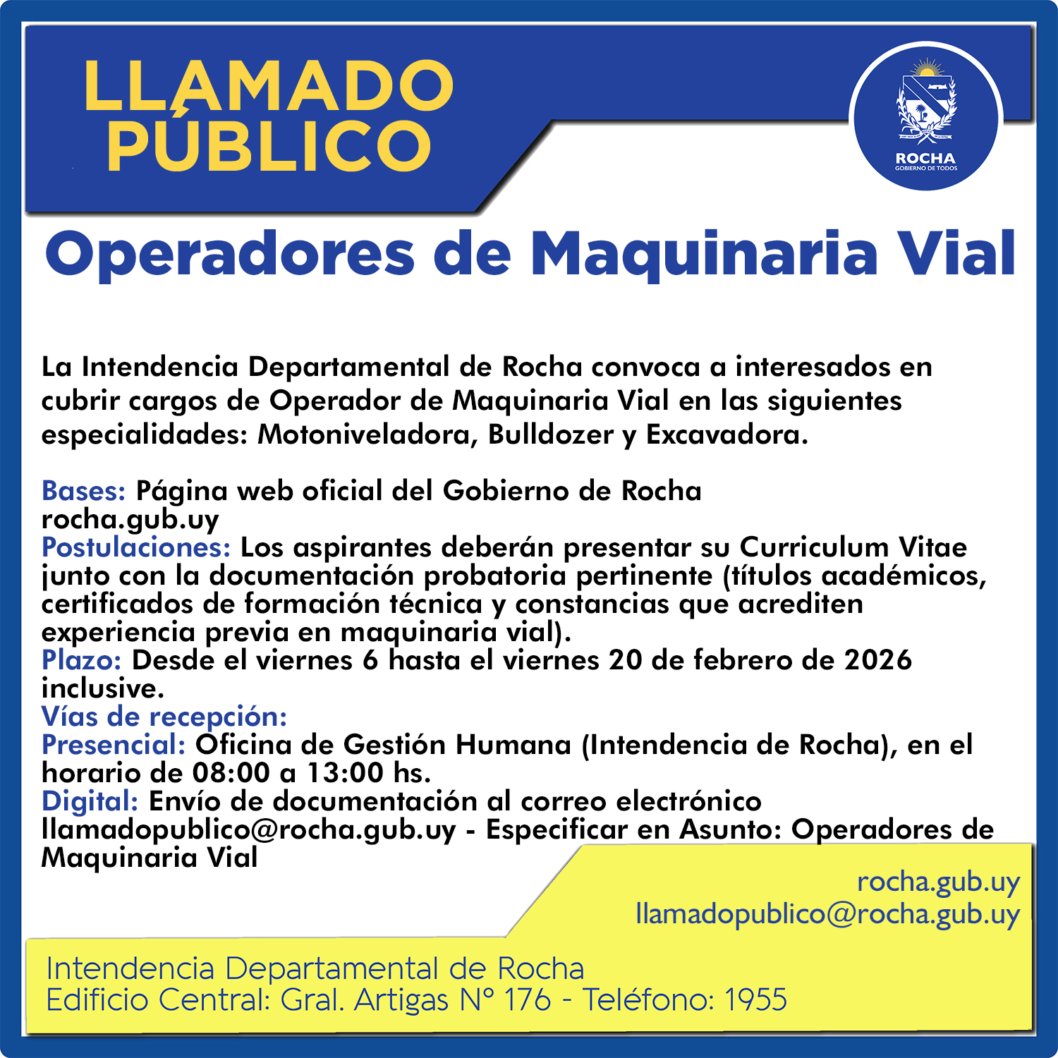 - Digital: al correo electrónico llamadopublico@rocha.gub.uy (Asunto: Operadores de Maquinaria Vial).