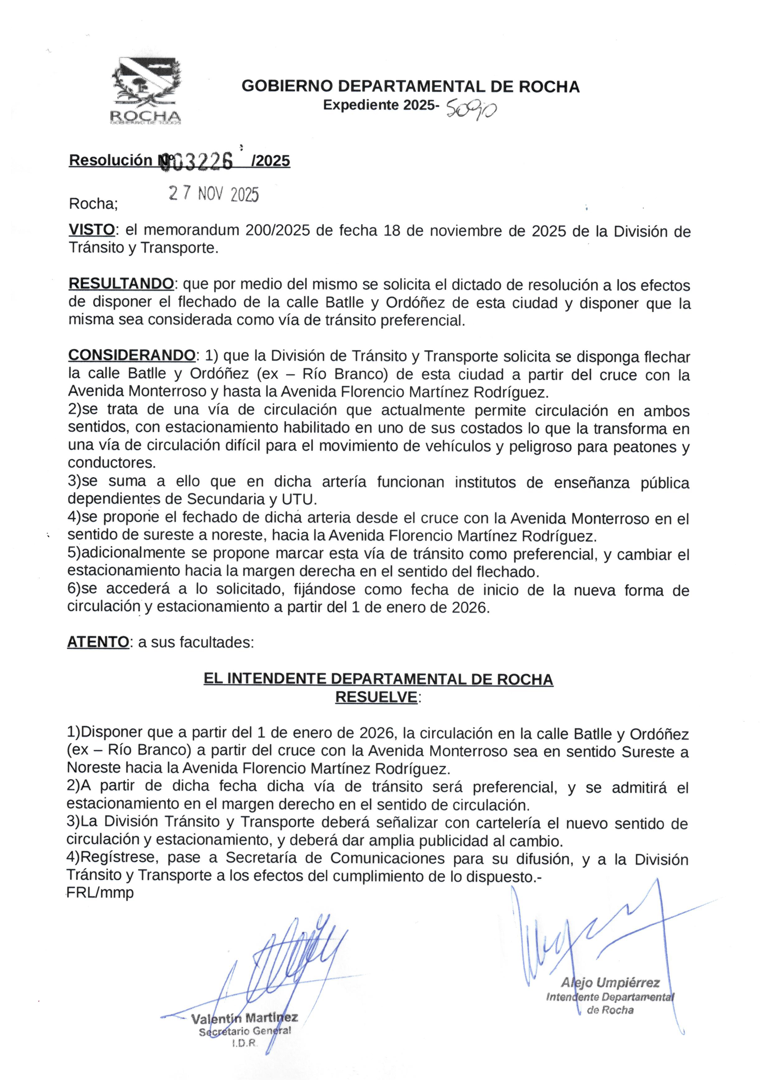 El Gobierno Departamental de Rocha emitió la Resolución Nº 33226/2025, mediante la cual se establece un cambio significativo en la circulación vehicular de la calle Batlle y Ordóñez (ex Río Branco), atendiendo a una solicitud de la División de Tránsito y Transporte.