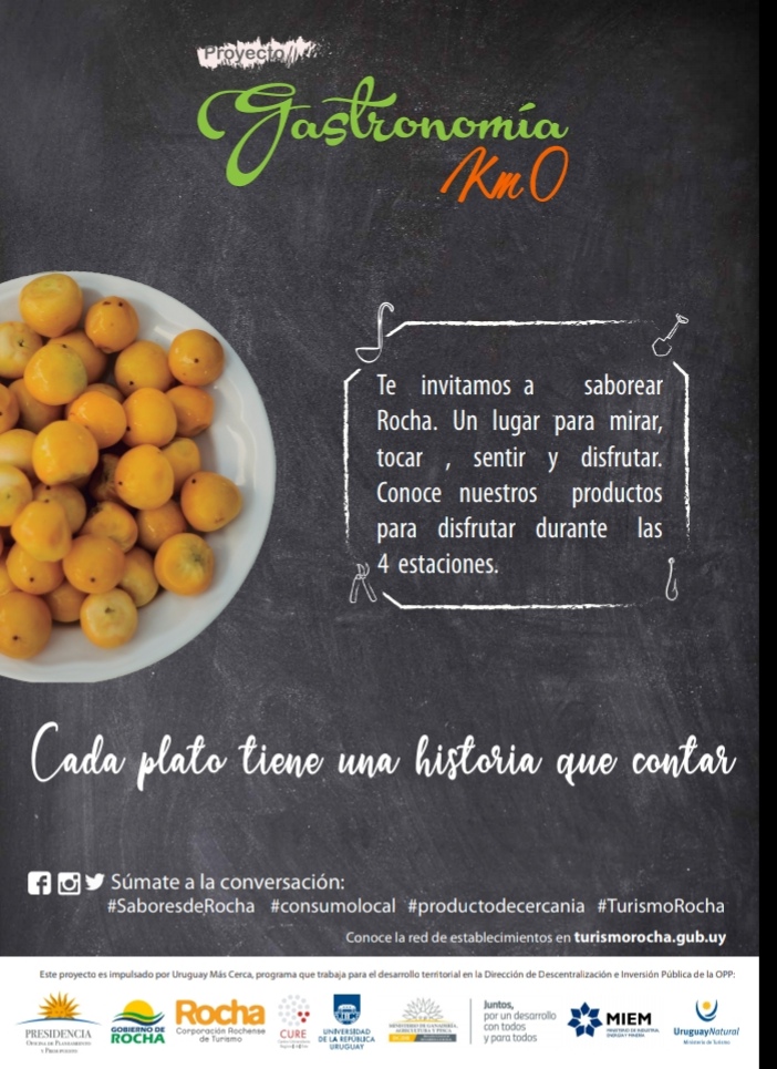 Gastronomía km0 nace con el propósito de fortalecer el entramado de empresas gastronómicas y productores del departamento de Rocha. Es impulsado por las Direcciones de Turismo, Producción y Desarrollo de la Intendencia de Rocha, la Corporación Rochense de Turismo y el Centro Universitario Región Este de la Universidad de la República, con el apoyo de MGAP/DGDR, MIEM y MINTUR, y financiado por el programa "Uruguay más cerca" de la Oficina de Planeamiento y Presupuesto -OPP-.