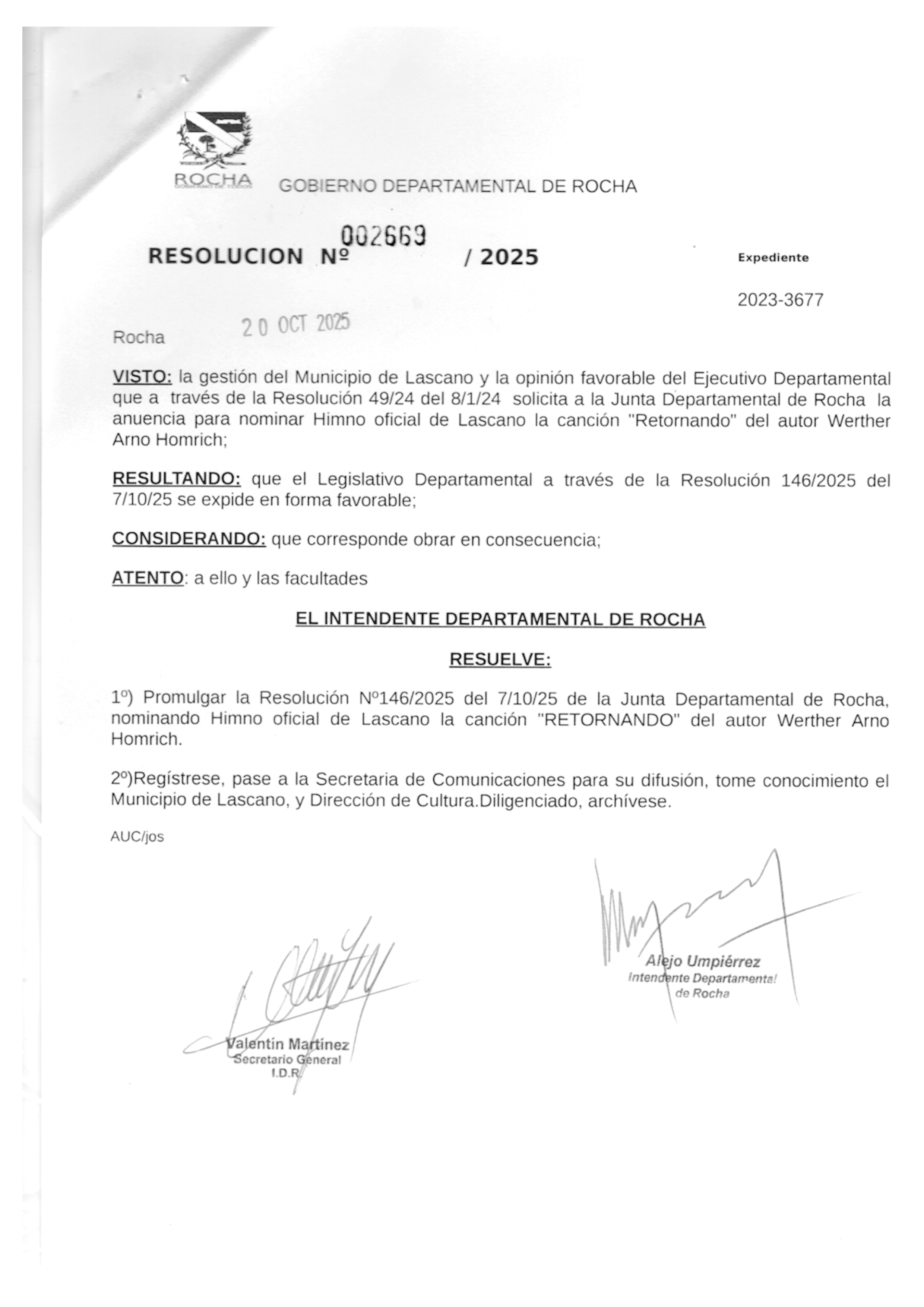 El Gobierno Departamental de Rocha oficializó este 20 de octubre de 2025 la nominación de “Retornando”, del autor Werther Arno Homrich, como Himno Oficial de la ciudad de Lascano, tras la promulgación de la Resolución Nº146/2025 aprobada por la Junta Departamental.