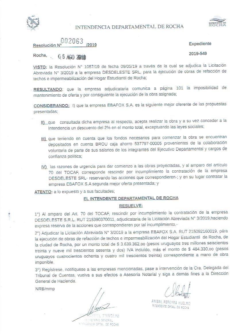 En la misma resolución se adjudica la Licitación Abreviada N| 3/2019 a la empresa EBAFOX S.A para la adjudicación de las obras de refacción de techos e impermeabilización del Hogar Estudiantil de Rocha, por un monto total de $ 3.639.362,oo (pesos uruguayos tres millones seiscientos treinta y nueve mil trescientos sesenta y dos) IVA incluido, más el monto de $ 484.330,oo (pesos uruguayos cuatrocientos ochenta y cuatro mil trescientos treinta) correspondiente a mano de obra imponible.