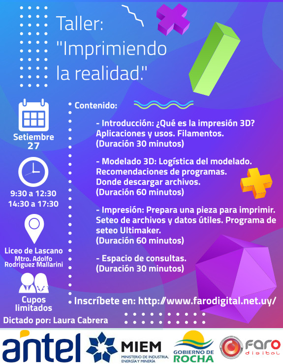 Estimad@s, el Viernes 27 de Setiembre se estará realizando en la ciudad de Lascano un taller de impresión 3D en las instalaciones del Liceo Mtro. Adolfo Rodriguez Mallarini.