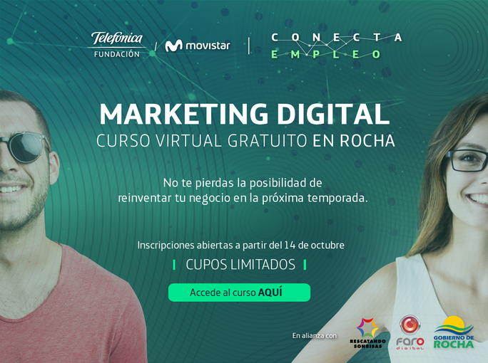 Fundación Telefónica – Movistar y la Intendencia de Rocha a través de su proyecto Faro Digital, invitan a los mayores de 15 años interesados en formarse para mejorar sus competencias laborales, a realizar la curso virtual en Marketing Digital gratuito.