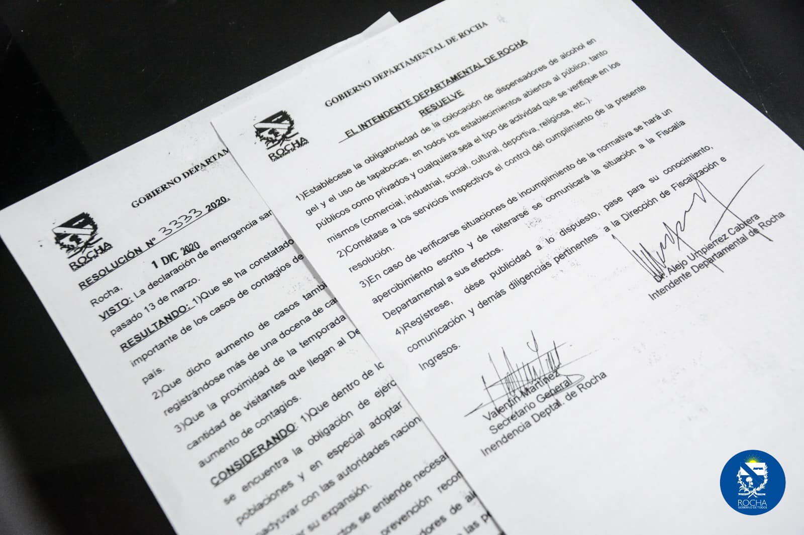 De acuerdo con la situación de emergencia sanitaria que se mantiene en nuestro pais desde el pasado 13 de marzo y ya que en el pasado mes de noviembre se han constatado mas cantidad de casos de Covid-19 en distintos departamentos del pais, el Intendente de Rocha Alejo Umpierrez resolvió en la tarde de hoy establecer la obligatoriedad del uso de tapabocas y colocación de dispensadores de alcohol en gel en todos los establecimientos abiertos al público, tanto públicos como privados y cualquiera sea el tipo de actividad que se verifique en los mismos (comercial, industrial, social,cultural,deportiva, religiosa, etc.) En caso de comprobarse el incumplimiento a la normativa se hará un apercibimiento escrito y de reiterarse se comunicará la situación a la Fiscalia Departamental.