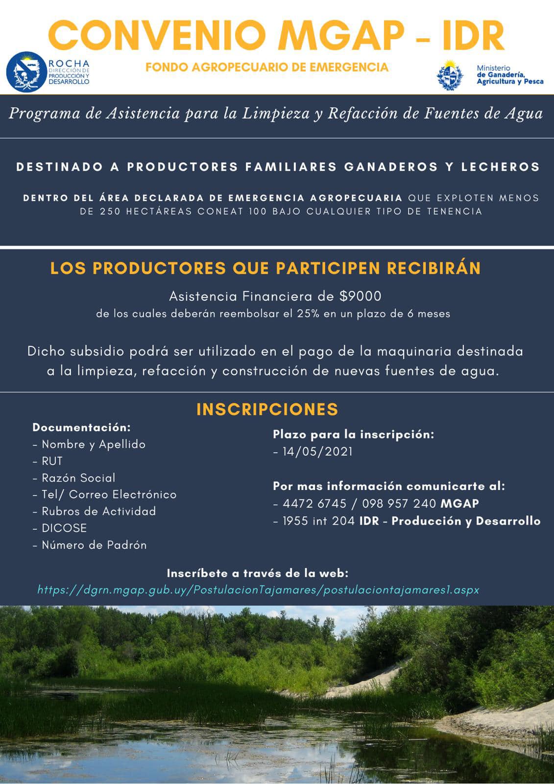 Recientemente se ha llegado a un acuerdo entre el Gobierno de Rocha y el Ministerio de Ganadería Agricultura y Pesca, por el cual y mediante convenio, el MGAP transfiere fondos del FAE (FONDO AGROPECUARIO DE EMERGENCIA) a la misma, con los que se desarrollara un programa de asistencia para la limpieza y refacción de fuentes de agua.