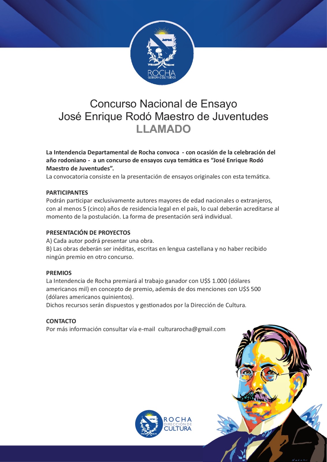 La Intendencia Departamental de Rocha convoca – con ocasión de la celebración del año rodoniano – a un concurso de ensayos cuya temática es “José Enrique Rodó Maestro de Juventudes”.