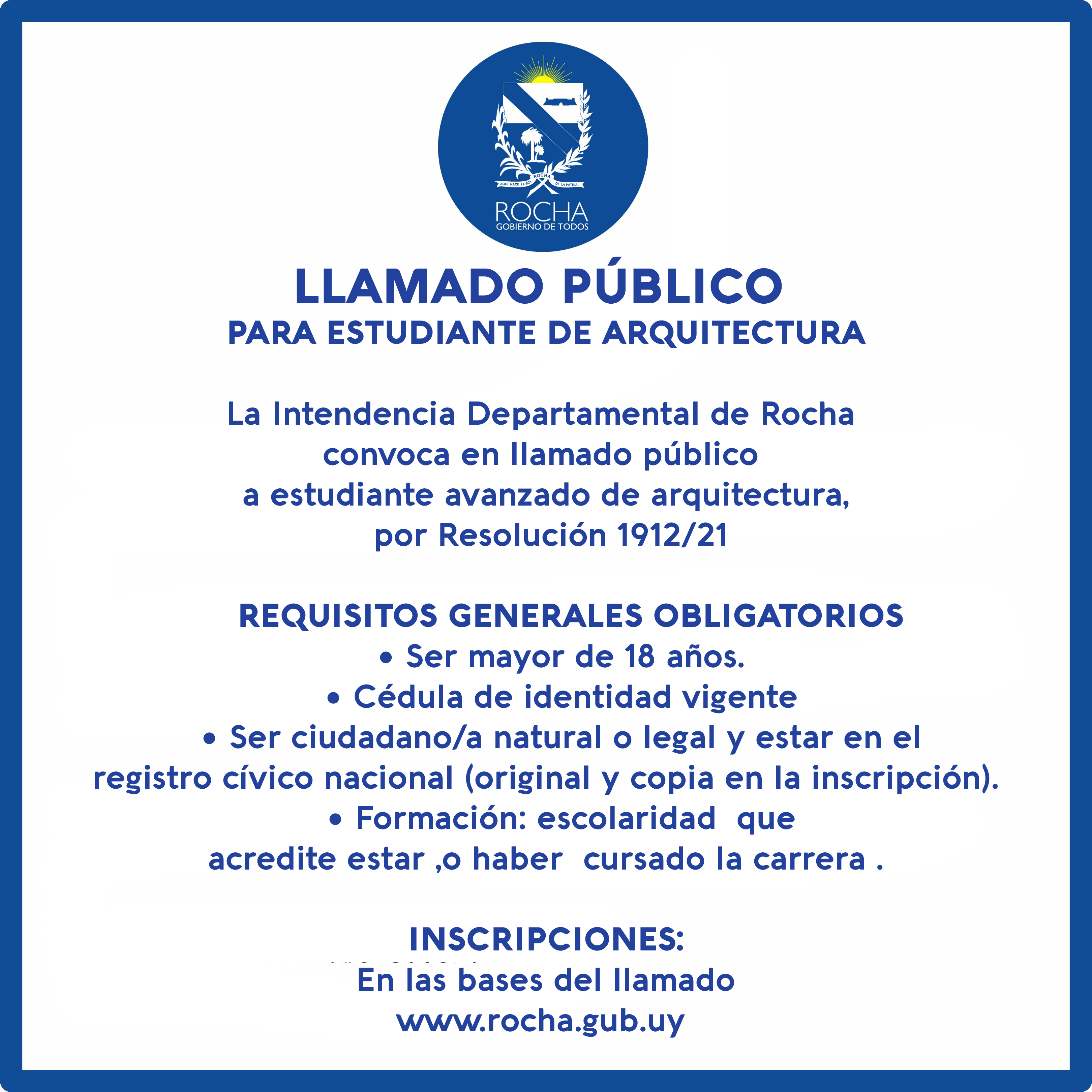 La Intendencia Departamental de Rocha convoca en llamado público a interesados en postularse para desarrollar tareas en ARQUITECTURA, por Resolución 1912/21.