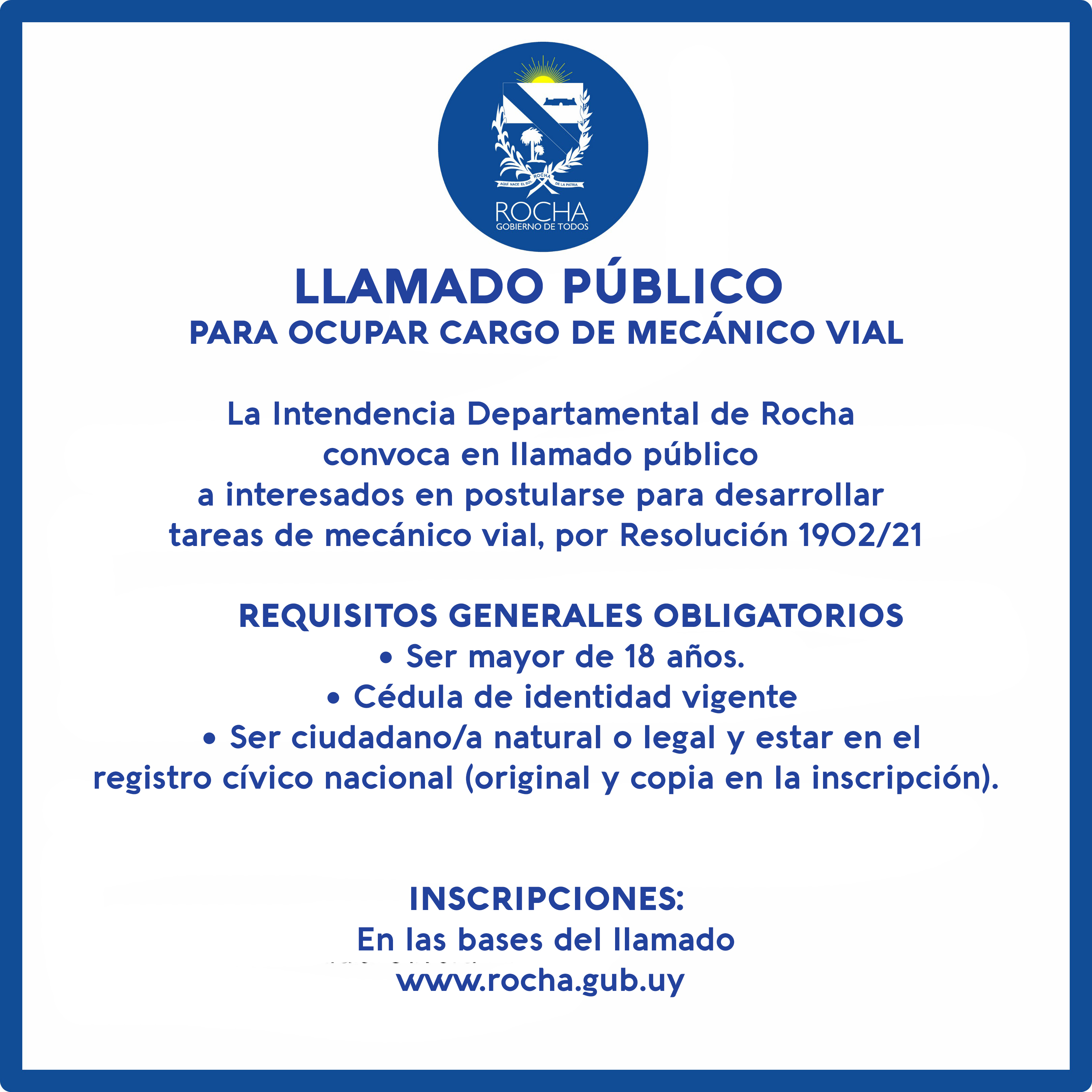 La Intendencia Departamental de Rocha convoca en llamado público a interesados en postularse para desarrollar tareas de MECÁNICO VIAL, por Resolución 1902/21
