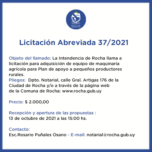 Objeto del llamado: La Intendencia de Rocha llama a licitación para adquisición de equipo de maquinaria agrícola para Plan de apoyo a pequeños productores rurales.