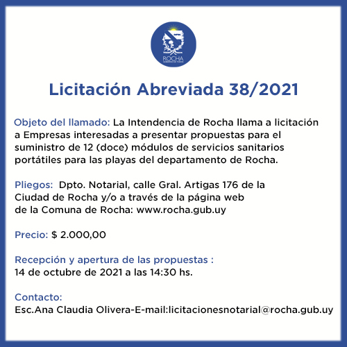 Objeto del llamado: La Intendencia de Rocha llama a licitación a Empresas interesadas a presentar propuestas para el suministro de 12 (doce) módulos de servicios sanitarios portátiles para las playas del departamento de Rocha.