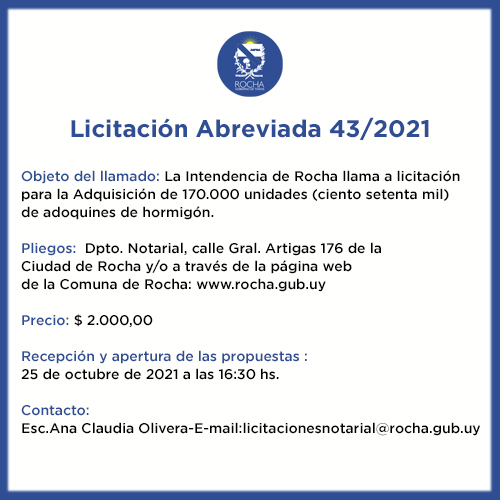 Objeto del llamado: La Intendencia de Rocha llama a licitación para la Adquisición de 170.000 unidades (ciento setenta mil) de adoquines de hormigón.