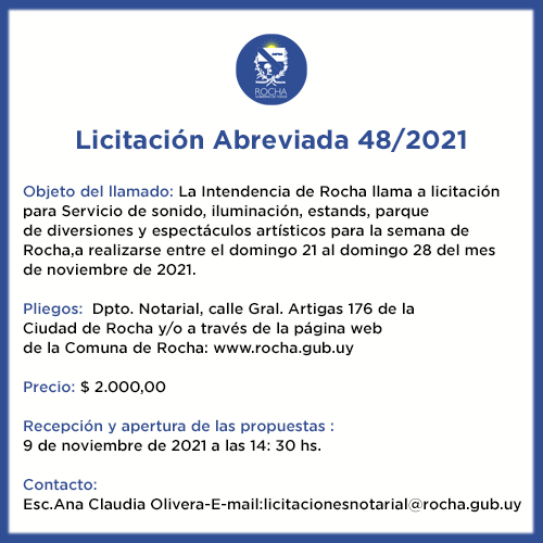 Objeto del llamado: La Intendencia de Rocha llama a licitación para Servicio de sonido, iluminación, estands, parque de diversiones y espectáculos artísticos para la semana de Rocha, a realizarse entre el domingo 21 al domingo 28 del mes de noviembre de 2021.