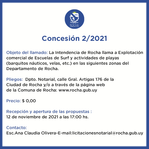 Objeto del llamado: La Intendencia de Rocha llama a Explotación comercial de Escuelas de Surf y actividades de playas (barquitos náuticos, velas, etc.) en las siguientes zonas del Departamento de Rocha.