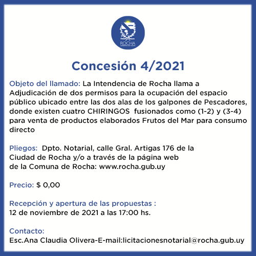 Objeto del llamado: La Intendencia de Rocha llama a Adjudicación de dos permisos para la ocupación del espacio público ubicado entre las dos alas de los galpones de Pescadores, donde existen cuatro CHIRINGOS fusionados como (1-2) y (3-4) para venta de productos elaborados Frutos del Mar para consumo directo