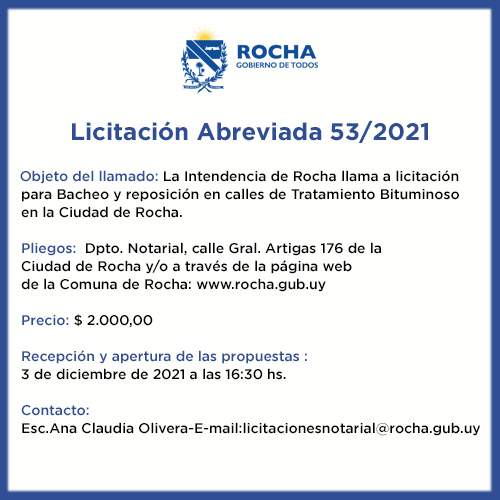 Pliegos:  Dpto. Notarial, calle Gral. Artigas 176 de la Ciudad de Rocha y en la Oficina de la IDR y/o a través de la página web de la Comuna de Rocha: www.rocha.gub.uy