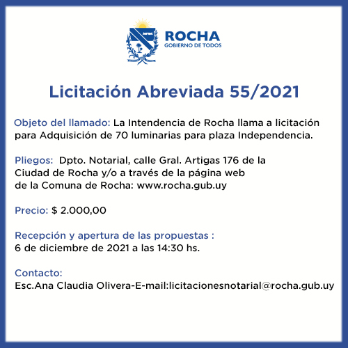 Pliegos: Dpto. Notarial, calle Gral. Artigas 176 de la Ciudad de Rocha y en la Oficina de la IDR y/o a través de la página web de la Comuna de Rocha: www.rocha.gub.uy