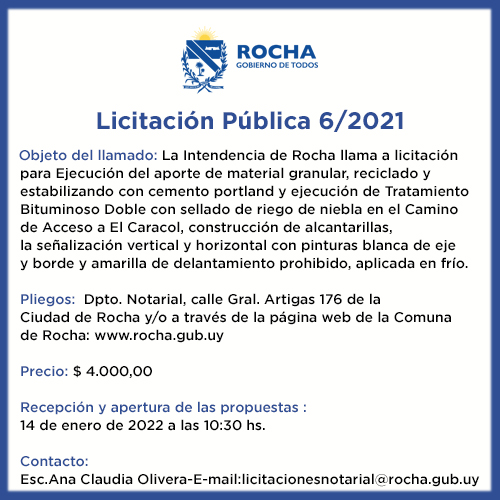 Objeto del llamado: La Intendencia de Rocha llama a licitación