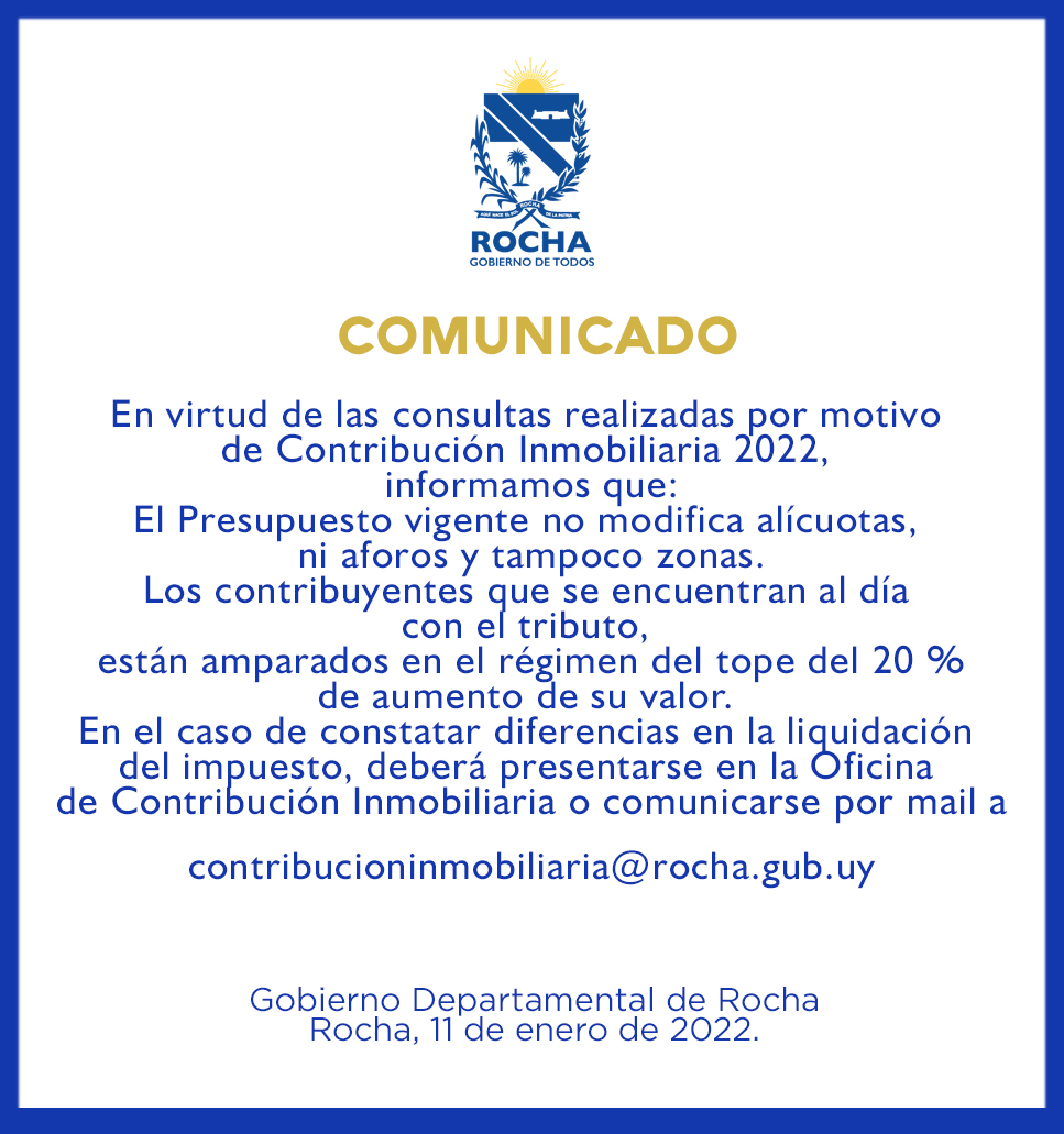 En virtud de las consultas realizadas por motivo de Contribución Inmobiliaria 2022, la Intendencia Departamental de Rocha informa que: