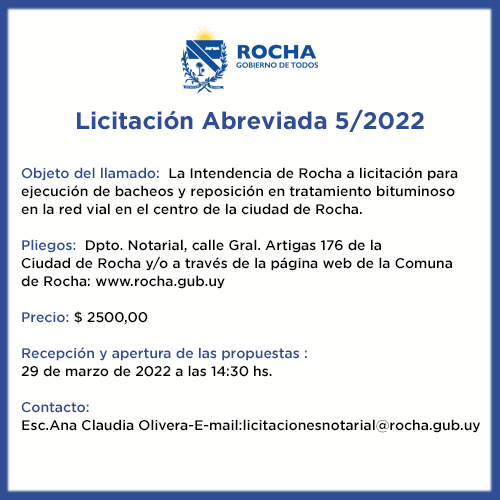 Pliegos:  Intendencia Departamental de Rocha, Departamento Notarial, calle Gral. Artigas 176 de la Ciudad de y/o a través de la página web de la Comuna de Rocha www.rocha.gub.uy
