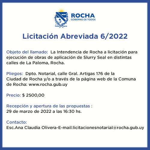 Contacto: Ana Claudia Olivera- E-mail: licitacionesnotarial@rocha.gub.uy
