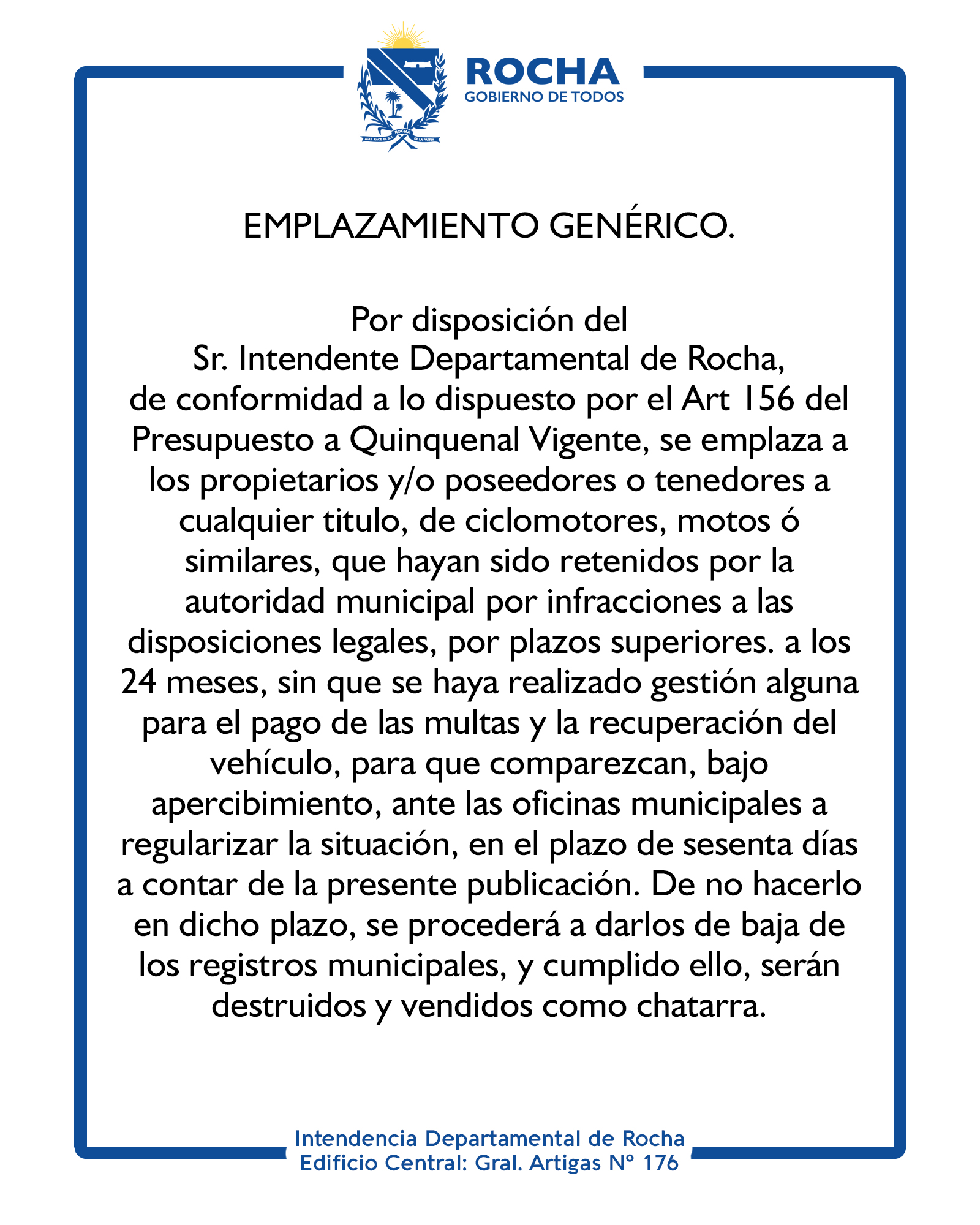 Por disposición del Sr. Intendente Departamental de Rocha, de conformidad a lo dispuesto por el Art 156 del Presupuesto a Quinquenal Vigente, se emplaza a los propietarios y/o poseedores o tenedores a cualquier titulo, de ciclomotores, motos ó similares, que hayan sido retenidos por la autoridad municipal por infracciones a las disposiciones legales, por plazos superiores. a los 24 meses, sin que se haya realizado gestión alguna para el pago de las multas y la recuperación del vehículo, para que comparezcan, bajo apercibimiento, ante las oficinas municipales a regularizar la situación, en el plazo de sesenta días a contar de la presente publicación. De no hacerlo en dicho plazo, se procederá a darlos de baja de los registros municipales, y cumplido ello, serán destruidos y vendidos como chatarra.