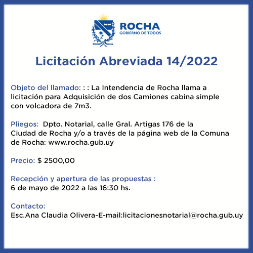 Pliegos:  Intendencia Departamental de Rocha, Departamento Notarial, calle Gral. Artigas 176 de la Ciudad de y/o a través de la página web de la Comuna de Rocha www.rocha.gub.uy