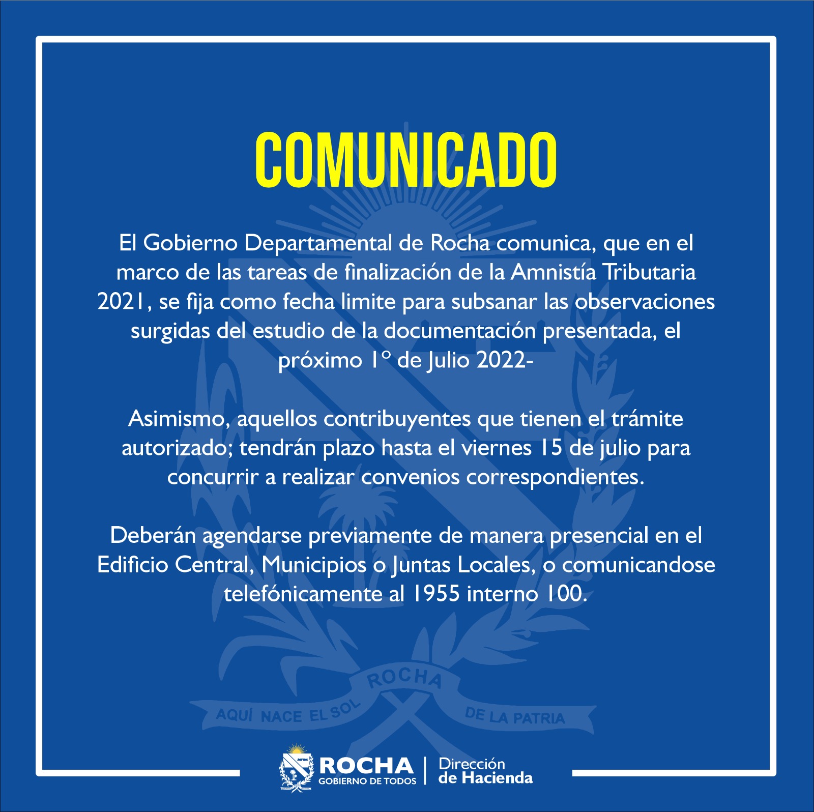 El Gobierno Departamental de Rocha comunica, que en el marco de las tareas de finalización de la Amnistía Tributaria 2021, se fija como fecha límite para subsanar las observaciones surgidas del estudio de la documentación presentada, el próximo viernes 1 de Julio de 2022.