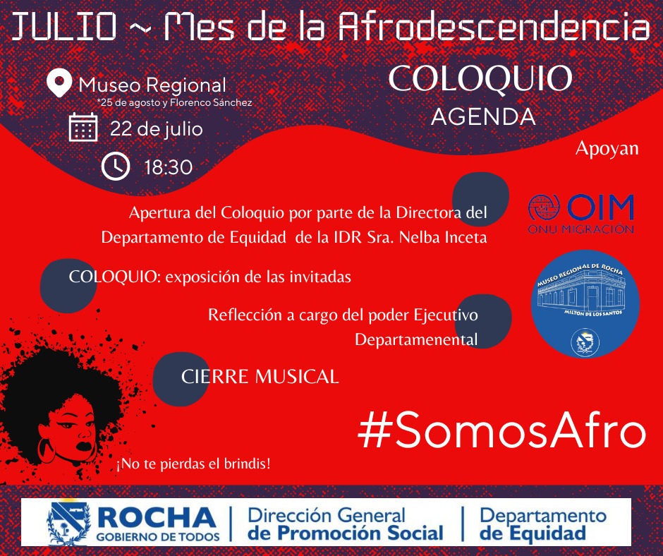 La Dirección de Promoción Social a través del Departamento de Equidad tiene el agrado de invitar a participar de las acitvidades realizadas en el marco del mes de la Afrodescendencia. En este caso la invitación se realiza con motivo del coloquio sobre el tema que se realizará en el Museo Regional de Rocha el próximo 22 de julio a las 18:30 hs. #GobiernodeTodos
