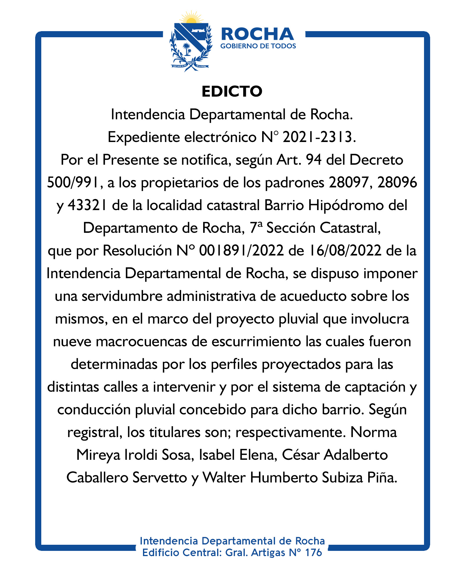 EDICTO. Intendencia Departamental de Rocha. Expediente electrónico N° 2021-2313. Por el Presente se notifica, según Art. 94 del Decreto 500/991, a los propietarios de los padrones 28097, 28096 y 43321 de la localidad catastral Barrio Hipódromo del Departamento de Rocha, 7ª Sección Catastral, que por Resolución No 001891/2022 de 16/08/2022 de la Intendencia Departamental de Rocha, se dispuso imponer una servidumbre administrativa de acueducto sobre los mismos, en el marco del proyecto pluvial que involucra nueve macrocuencas de escurrimiento las cuales fueron determinadas por los perfiles proyectados para las distintas calles a intervenir y por el sistema de captación y conducción pluvial concebido para dicho barrio. Según registral, los titulares son; respectivamente. Norma Mireya Iroldi Sosa, Isabel Elena, César Adalberto Caballero Servetto y Walter Humberto Subiza Piña.