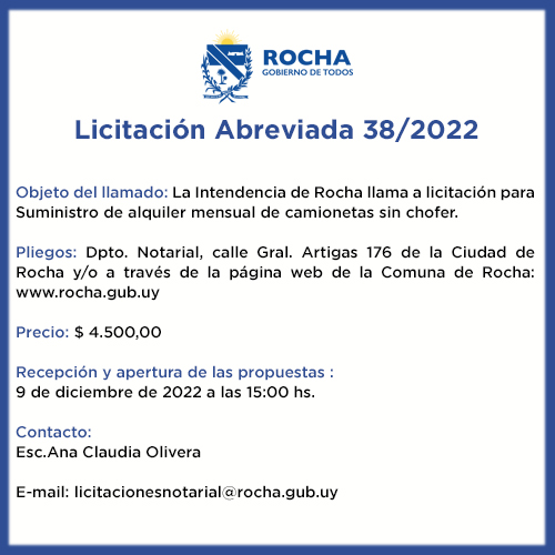 Pliegos:  Intendencia Departamental de Rocha, Departamento Notarial, calle Gral. Artigas 176 de la Ciudad de y/o a través de la página web de la Comuna de Rocha www.rocha.gub.uy