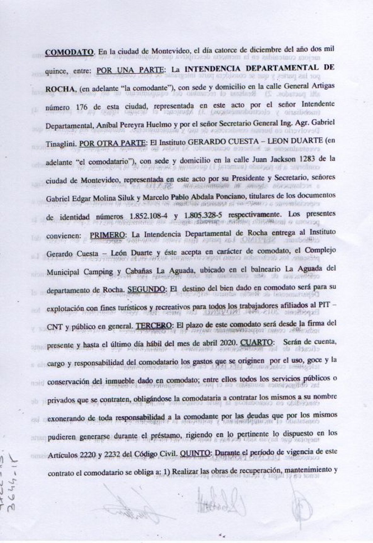 COMODATO: En la ciudad de Montevideo, el día catorce de diciembre del año dos mil quince, entre: POR UNA PARTE: La INTENDENCIA DEPARTAMENTAL DE ROCHA, (en adelante “la comodante”), con sede y domicilio en la calle General Artigas número 176 de esta ciudad, representada en este acto por el señor Intendente Departamental Aníbal Pereyra Huelmo y por el señor Secretario General Ing. Agr. Gabriel Tinaglini. POR OTRA PARTE: El Instituto GERARDO CUESTA – LEON DUARTE (en adelante “el comodatario”), con sede y domicilio en la calle Juan Jackson 1283 de la ciudad de Montevideo, representada en este acto por su Presidente y Secretario, señores Gabriel Edgar Molina Siluk y Marcelo Pablo Abdala Ponciano. Los presentes convienen: PRIMERO: La Intendencia Departamental de Rocha entrega al Instituto Gerardo Cuesta – León Duarte y éste acepta en carácter de comodato, el Complejo Municipal Camping y Cabañas La Aguada, ubicado en el balneario La Aguada del departamento de Rocha. SEGUNDO: El destino del bien dado en comodato será para su explotación con fines turísticos y recretativos para todos los trabajadores afiliados al PIT-CNT y público en general.