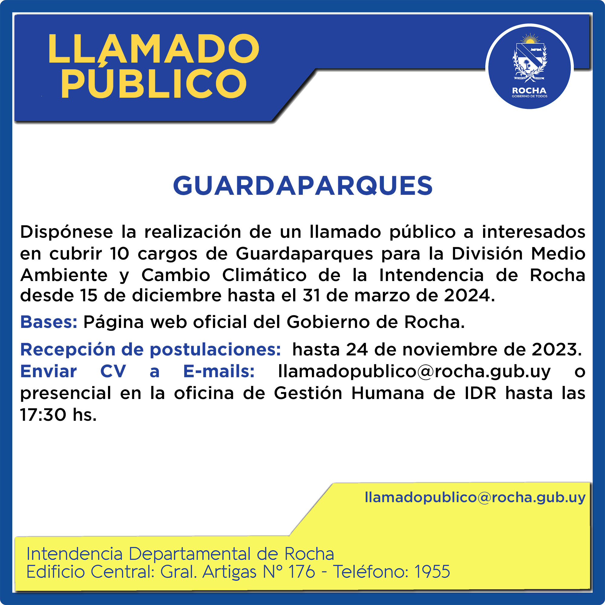Dispónese la realización de un llamado público a interesados en cubrir 10 cargos de Guardaparques para la División Medio Ambiente y Cambio Climático de la Intendencia de Rocha desde 15 de diciembre hasta el 31 de marzo de 2024.