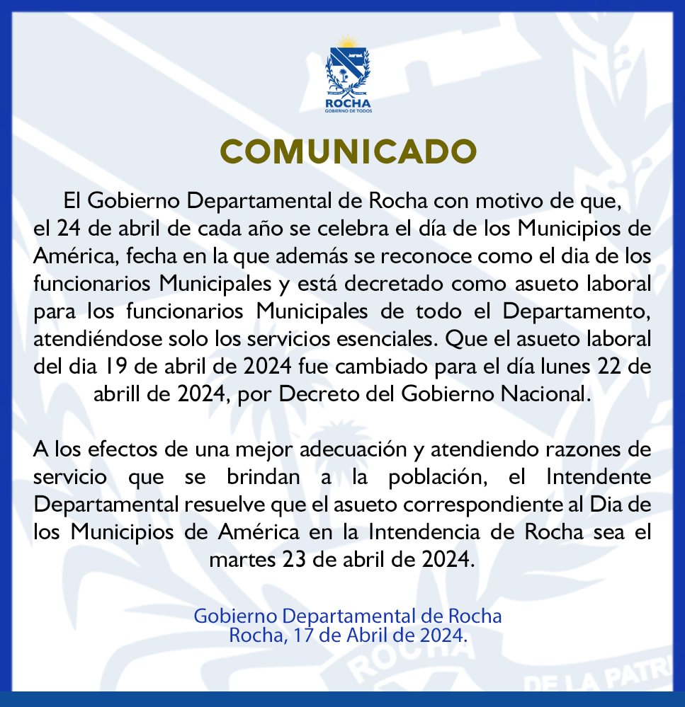 El Intendente Departamental de Rocha Alejo Umpiérrez por Resolución 1003/24 del 11 de abril de 2024 a dispuesto que el asueto correspondiente al día de los Municipios de América sea el martes 23 de abril atendiendo razones de servicio, trabajándose en forma normal el día 24 de abril de 2024.