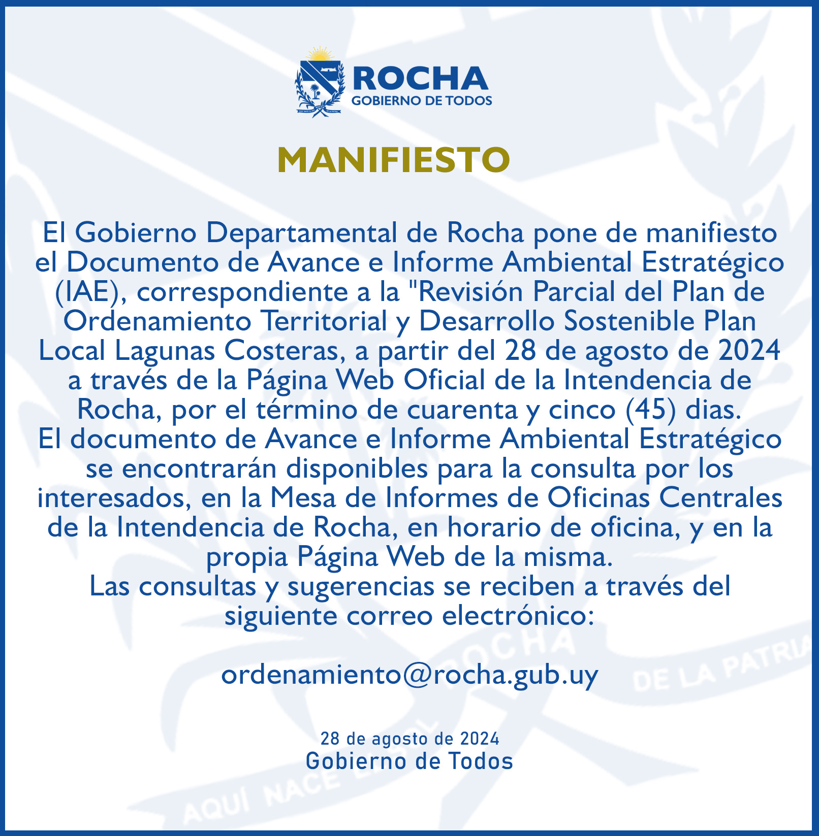 El Gobierno Departamental de Rocha pone de manifiesto el Documento de Avance e Informe Ambiental Estratégico (IAE), correspondiente a la "Revisión Parcial del Plan de Ordenamiento Territorial y Desarrollo Sostenible Plan Local Lagunas Costeras, a partir del 28 de agosto de 2024 a través de la Página Web Oficial de la Intendencia de Rocha, por el término de cuarenta y cinco (45) dias.