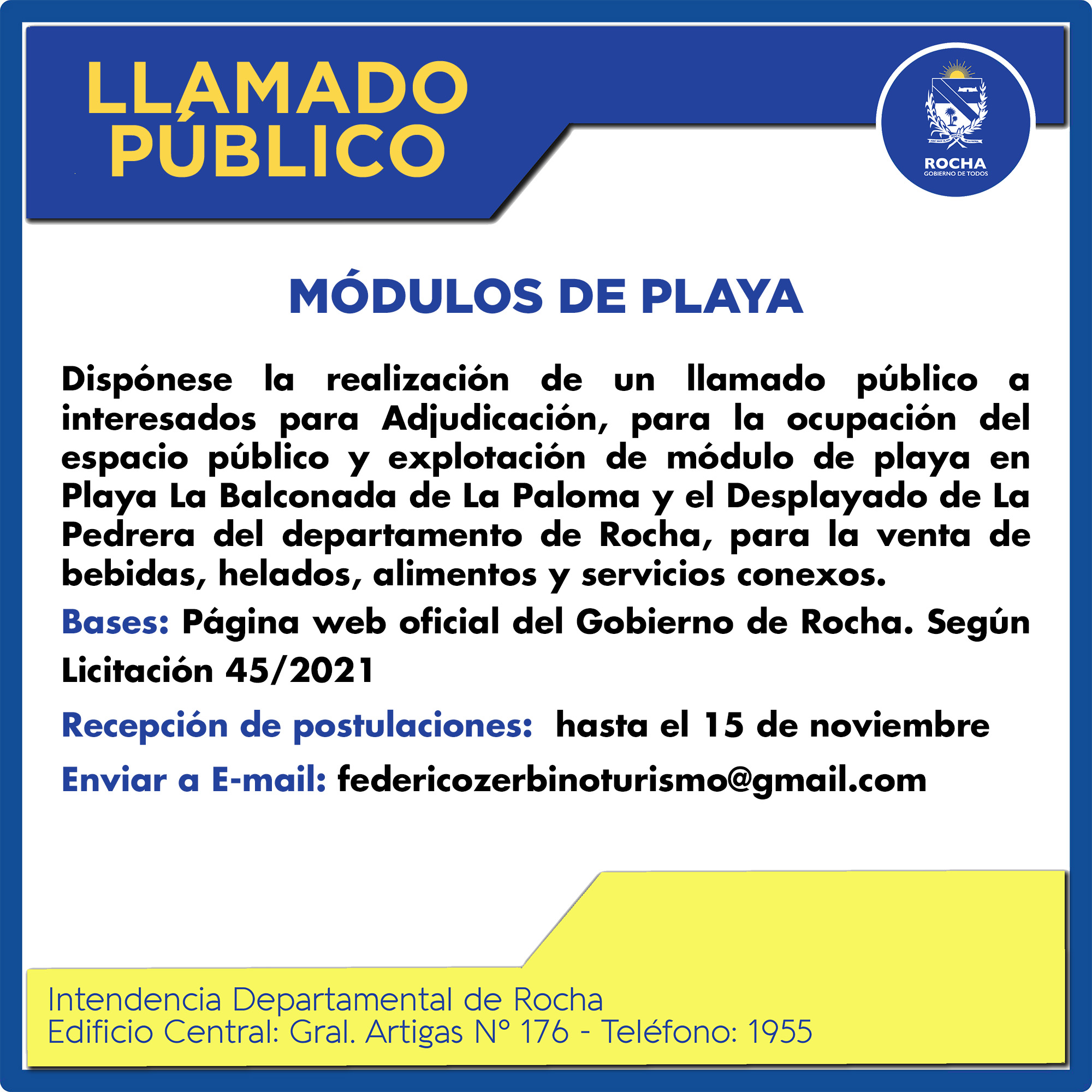 Dispónese la realización de un llamado público a interesados para Adjudicación para la ocupación del espacio público y explotación de módulo de playa en Playa La Balconada de La Paloma y el Desplayado de La Pedrera del departamento de Rocha, para la venta de bebidas, helados, alimentos y servicios conexos.