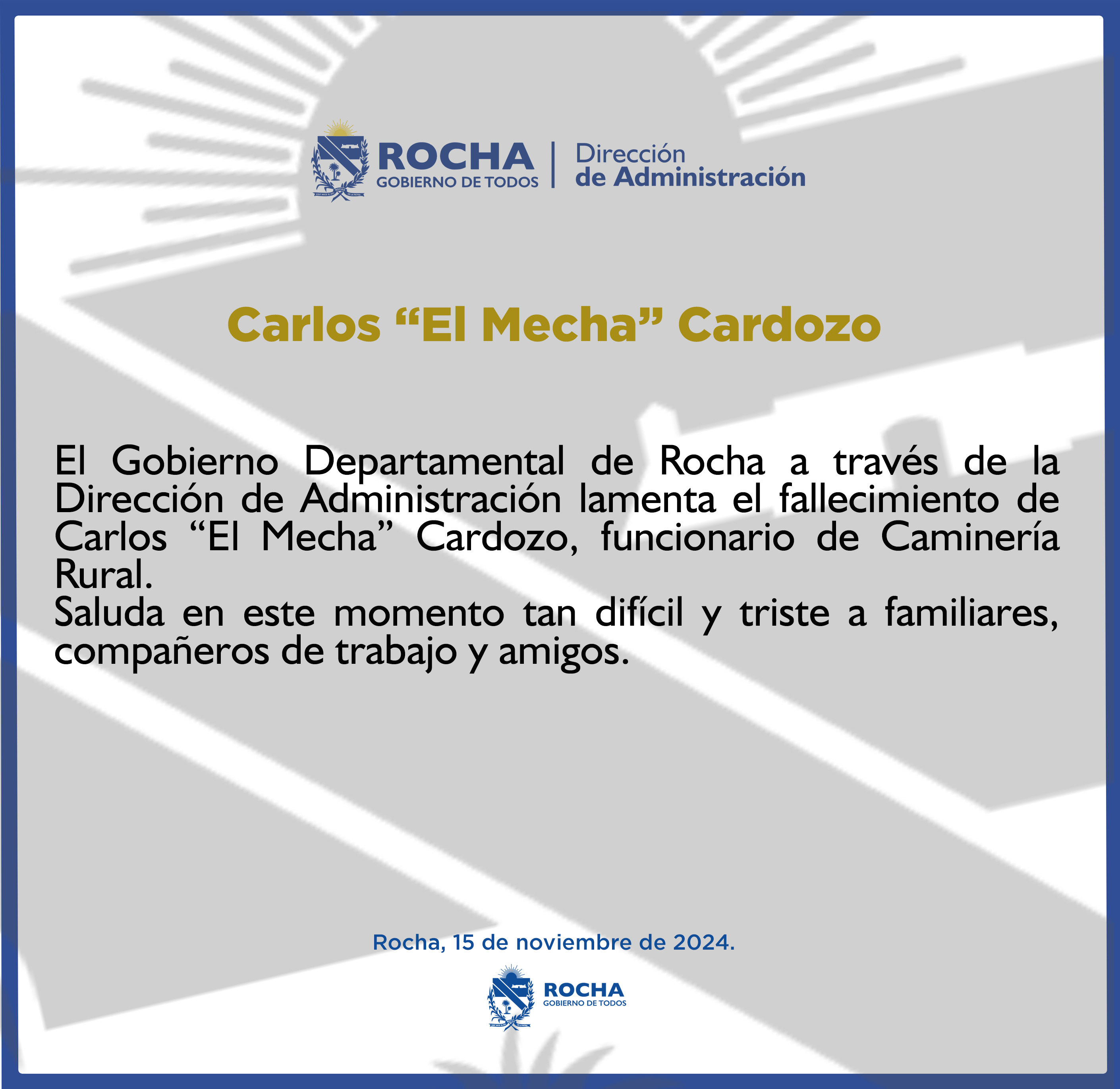 El Gobierno Departamental de Rocha a través de la Dirección de Administración lamenta el fallecimiento de Carlos “El Mecha” Cardozo, funcionario de Caminería Rural.