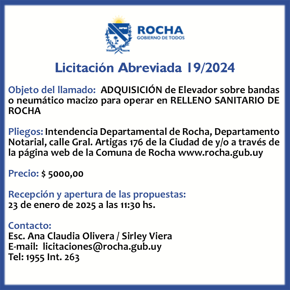 Objeto del llamado: La Intendencia de Rocha a licitación para ADQUISICIÓN de Elevador sobre bandas o neumático macizo para operar en RELLENO SANITARIO DE ROCHA