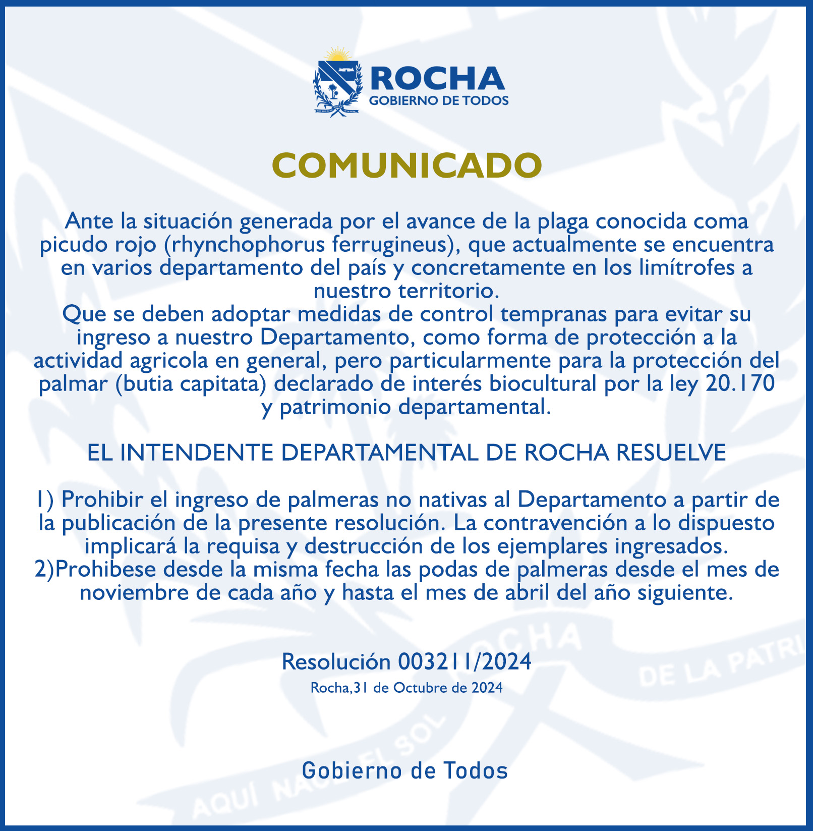 VISTO la situación generada por el avance de la plaga conocida como picudo rojo (rhynchophorus ferrugineus), que actualmente se encuentra en varios departamento del pals y concretamente en los limitrofes al nuestro.