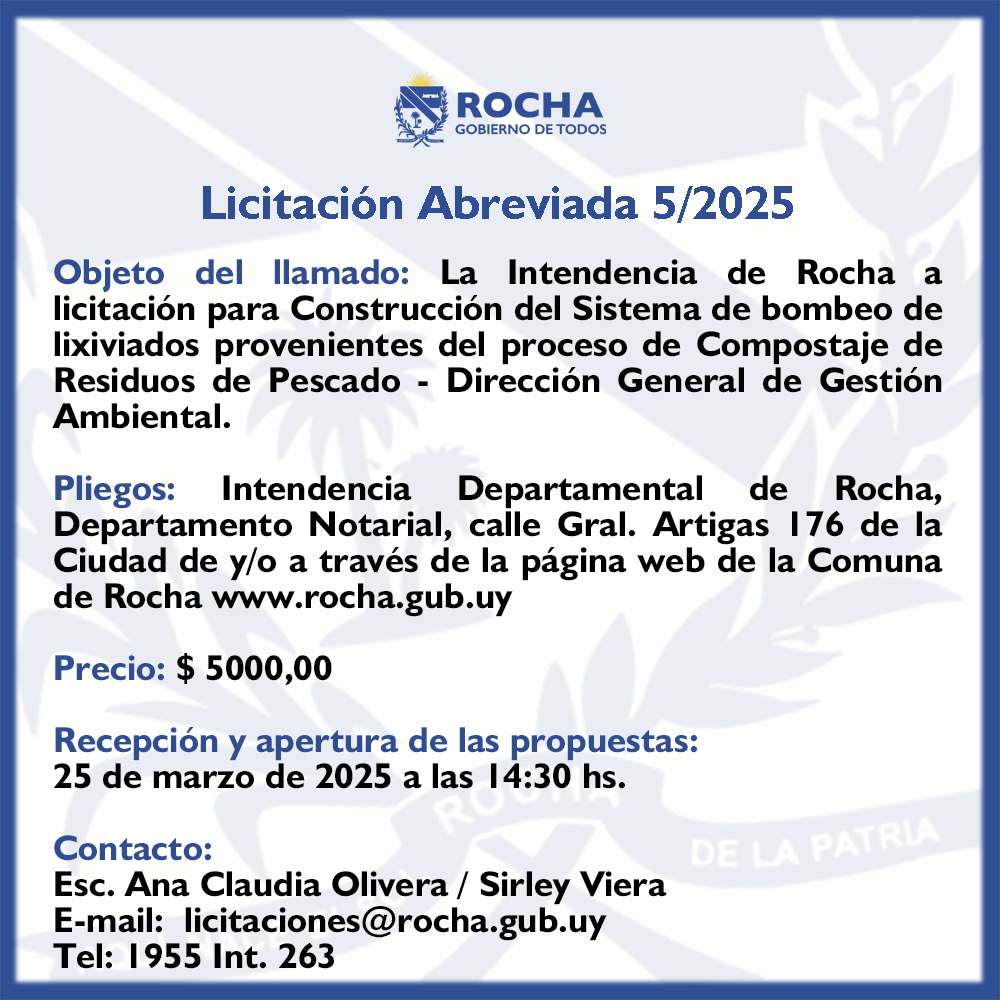 Objeto del llamado: La Intendencia de Rocha a licitación para Construcción del Sistema de bombeo de lixiviados provenientes del proceso de Compostaje de Residuos de Pescado - Dirección General de Gestión Ambiental.