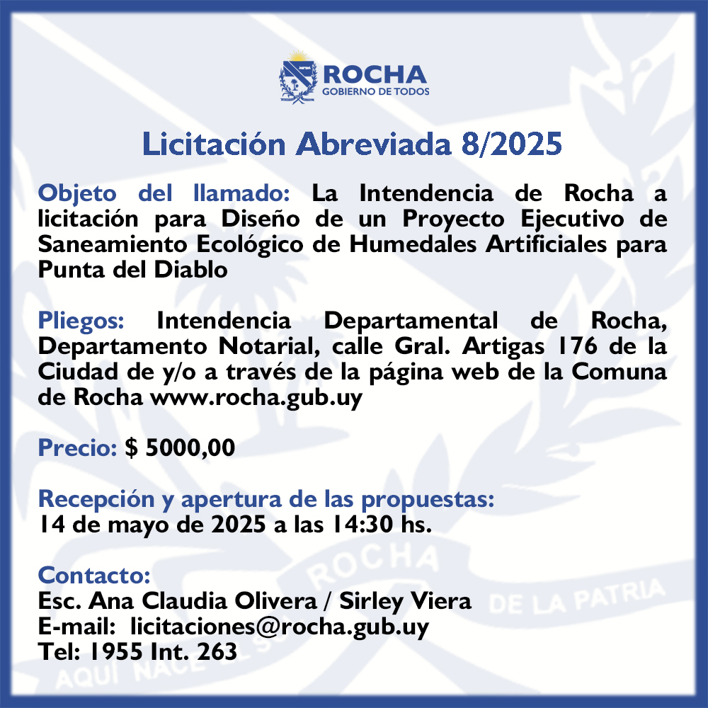 Contacto: Ana Claudia Olivera- E-mail: licitaciones@rocha.gub.uy