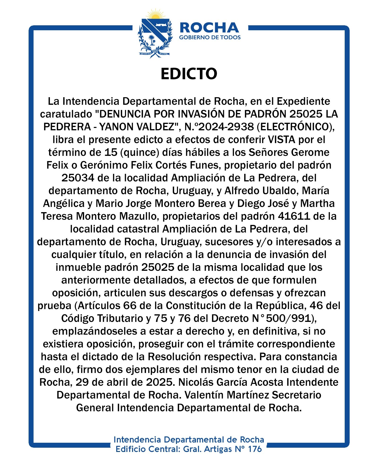 La Intendencia Departamental de Rocha, en el Expediente caratulado "DENUNCIA POR INVASIÓN DE PADRÓN 25025 LA PEDRERA - YANON VALDEZ", N.º2024-2938 (ELECTRÓNICO), libra el presente edicto a efectos de conferir VISTA por el término de 15 (quince) días hábiles a los Señores Gerome Felix o Gerónimo Felix Cortés Funes, propietario del padrón 25034 de la localidad Ampliación de La Pedrera, del departamento de Rocha, Uruguay, y Alfredo Ubaldo, María Angélica y Mario Jorge Montero Berea y Diego José y Martha Teresa Montero Mazullo, propietarios del padrón 41611 de la localidad catastral Ampliación de La Pedrera, del departamento de Rocha, Uruguay, sucesores y/o interesados a cualquier título, en relación a la denuncia de invasión del inmueble padrón 25025 de la misma localidad que los anteriormente detallados, a efectos de que formulen oposición, articulen sus descargos o defensas y ofrezcan prueba (Artículos 66 de la Constitución de la República, 46 del Código Tributario y 75 y 76 del Decreto N°500/991), emplazándoseles a estar a derecho y, en definitiva, si no existiera oposición, proseguir con el trámite correspondiente hasta el dictado de la Resolución respectiva. Para constancia de ello, firmo dos ejemplares del mismo tenor en la ciudad de Rocha, 29 de abril de 2025. Nicolás García Acosta Intendente Departamental de Rocha. Valentín Martínez Secretario General Intendencia Departamental de Rocha.