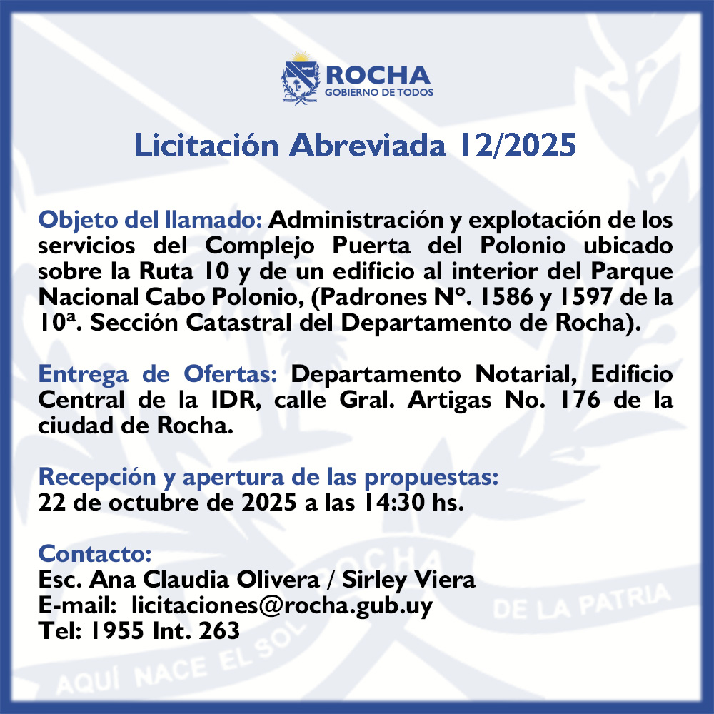 Contacto: Ana Claudia Olivera- E-mail: licitaciones@rocha.gub.uy