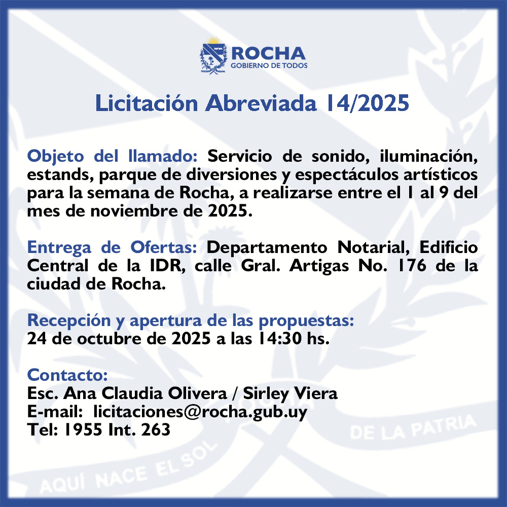 Objeto del llamado: Servicio de sonido, iluminación, estands, parque de diversiones y espectáculos artísticos para la semana de Rocha, a realizarse entre el 1 al 9 del mes de noviembre de 2025.