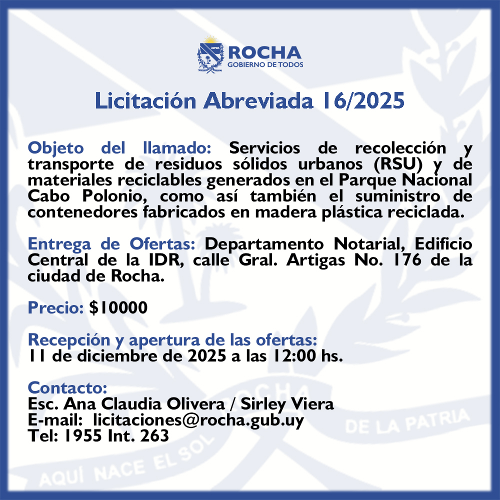 Contacto: Ana Claudia Olivera- E-mail: licitaciones@rocha.gub.uy
