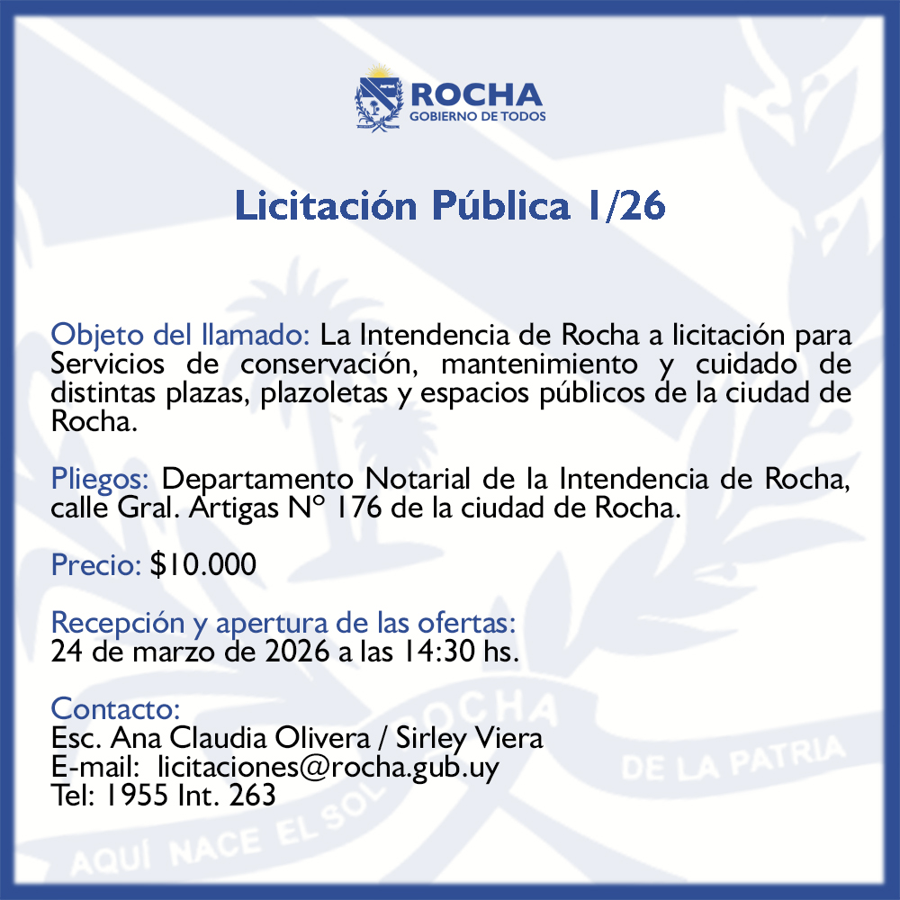 Licitación Pública 1/2026 Objeto del llamado: La Intendencia de Rocha a licitación para Servicios de conservación, mantenimiento y cuidado de distintas plazas, plazoletas y espacios públicos de la ciudad de Rocha. Pliegos: Intendencia Departamental de Rocha, Departamento Notarial, calle Gral. Artigas 176 de la Ciudad de y/o a través de la página web de la Comuna de Rocha www.rocha.gub.uy Precio: $ 10.000,00 Recepción y apertura de las propuestas : 24 de marzo de 2026 a las 14:30 hs. Contacto: Ana Claudia Olivera- E-mail: licitaciones@rocha.gub.uy