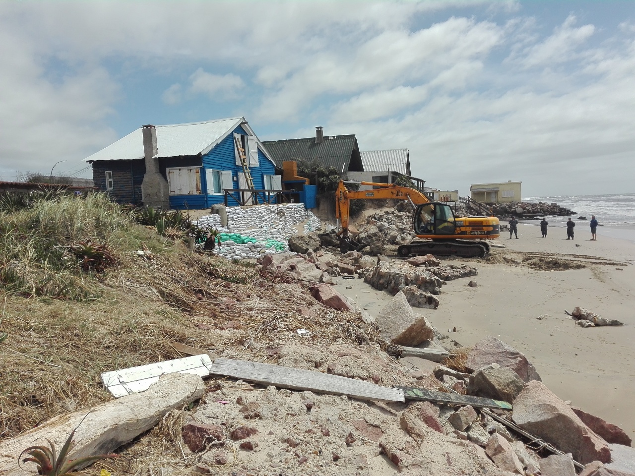 En esta jornada, se removieron muros que quedaban de una construcción ruinosa. Al mismo tiempo, se quitaron piedras que estaban diseminadas por la playa colocándolas contra el muro armado con bolsas y colocación de arena sobre estas.