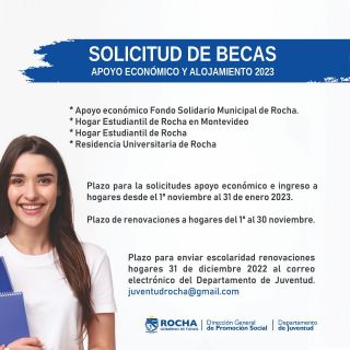01-11-2022 ℹ️PERIODO DE BECAS 💬A partir de la fecha queda habilitada la inscripción para la solicitud de becas correspondientes al periodo 2023. 👉Las mismas están comprendidas entre ayuda económica y alojamiento. 💬La inscripción se puede realizar a través de la página web del Gobierno Departamental y de forma presencial en las oficinas de Juventud. (...)