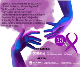 16-11-2022 Este jueves 17 de noviembre se realizará un taller denominado "Noviazgos libres y diversos". Dicho taller se desarrolla en el marco del mes de la eliminación de la violencia contra la mujer, lo organiza el Departamento de Género con el apoyo del Departamento de Diversidad e Inclusión y los talleristas son integrantes del Colectivo Trans del Uruguay, su presidenta la profesora Collette Spinetti y Thomas Berton encargado del área de Masculinidades Trans en CTU. La actividad se desarrollará en el Museo MIlton de los Santos de la ciudad de Rocha (...)